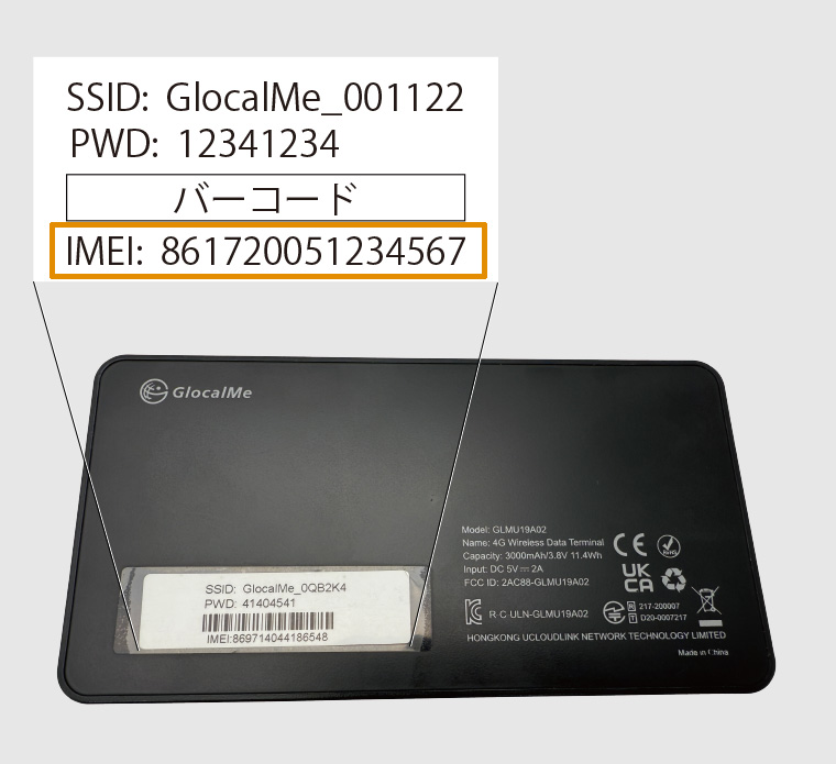 マイページ登録方法はこちら ・電源をオンにして画面を右に3回スライドさせます。 ![]() ・端末情報をタップしてください。 ![]() ・15桁のIMEI番号が表示されます。 「3551」から始まる数字です。 ![]() ・モバイルルーター背面に記載されています。 「8617」から始まる数字です。 ※ここにあるQRコードは使用しません ![]() ・電源をオンにして画面を右に1回スライドさせます。 ![]() ・端末情報をタップしてください。 ![]() ・15桁のIMEI番号が表示されます。 「8643」から始まる数字です。 ![]() ・モバイルルーター背面に記載されています。 「8697」から始まる数字です。
