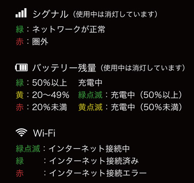 U20 ご利用ガイド PDFダウンロードはこちら 本体操作方法 右上部側面の電源ボタンを3秒長押しで、オン・オフを切り替えます。 ![]() 接続方法 モバイルルーターの電源をオンにしてから、接続するスマホやタブレットのWiFi設定で対象のSSIDを選択。 パスワードを入力します。 SSID、パスワードはモバイルルーター裏のシールに記載されています。 ![]() 追加チャージ方法 「追加ギガ購入ページ」 から追加したいデータプランをご購入ください。 ご注文時にIMEI番号を入力してください。 ![]() マイページ登録 登録には会員登録が必要です。 会員登録の方法は【チーターWiFi】ギガ残量確認のマイページ登録方法のページ をご確認ください。 よくある質問 よくある質問のページをご覧ください。 インジケーターランプについて ![]() |